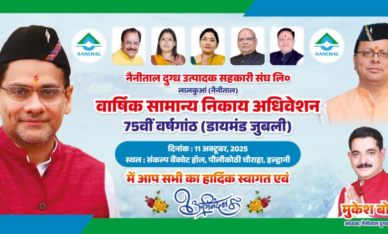 नैनीताल आँचल दुग्ध उत्पादक सहकारी संघ लिमिटेड का 75वां वार्षिक सामान्य निकाय अधिवेशन (डायमंड जुबली वर्ष) हल्द्वानी स्थित संकल्प बैंक्विट हॉल में भव्य रूप से आयोजित किया गया।