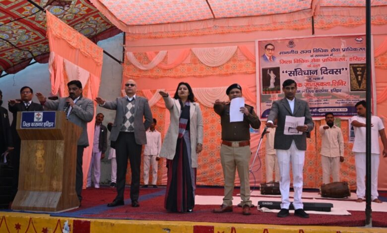 मुख्य अतिथि जनपद न्यायाधीश/अध्यक्ष, जिला विधिक सेवा प्राधिकरण, हरिद्वार श्री नरेन्द्र दत्त जी द्वारा सभी को सविधान की शपथ दिलाते हुए अपने उदबोधन में कहा कि आज हम लोग स्वतन्त्रता पूर्वक जीवन जी रहे वह संविधान की देन हे संविधान में प्रत्येक व्यक्तियों के अधिकारों की व्यवस्था की गई है, चाहे वह निर्बल, निर्धन, व असहाय ही क्यों ही न हो,।