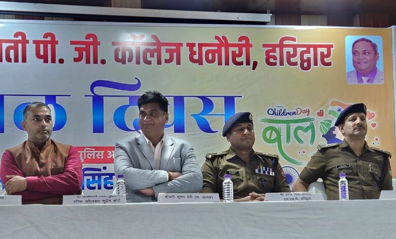 शुक्रवार को हरि ओम सरस्वती पीजी कॉलेज धनौरी हरिद्वार में बाल दिवस मनाया गया। कार्यक्रम के मुख्य अतिथि हरिद्वार के एसएसपी प्रमेन्द्र सिंह डोभाल ने कहा कि बाल दिवस का यह अवसर उनके लिए यादगार बन गया है। अपने पूरे सेवा काल में वह पहली बार किसी स्कूल – कॉलेज में छात्र-छात्राओं के बीच पहुंचे हैं। उन्होंने कहा कि छात्र-छात्राएं नशा मुक्ति और साइबर अपराध की रोकथाम जैसे मामलों में पुलिस के बड़े मददगार साबित हो सकते हैं। एसएसपी ने महाविद्यालय के मेधावी छात्र-छात्राओं को पुरस्कार प्रदान किए। एसपी ग्रामीण शेखर चंद्र सुयाल ने कहा कि अति पिछड़े क्षेत्र में स्थित इस महाविद्यालय के संस्थापक ने शिक्षा के क्षेत्र में क्रांतिकारी प्रयास किया है। जिसका परिणाम है कि यहां पढ़ने वाले बच्चों में अधिकतर छात्राएं हैं।